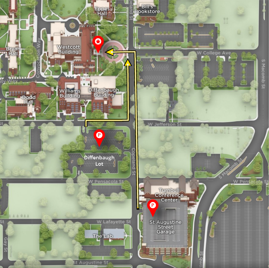 Event parking for families and friends is available in the St. Augustine Garage located on the corner of Pensacola and Copeland Streets or in the Diffenbaugh Lot on W. Jefferson Street, just west of the W. Jefferson/Copeland Street intersection. Faculty members and students may park in any convenient faculty or student lot.
