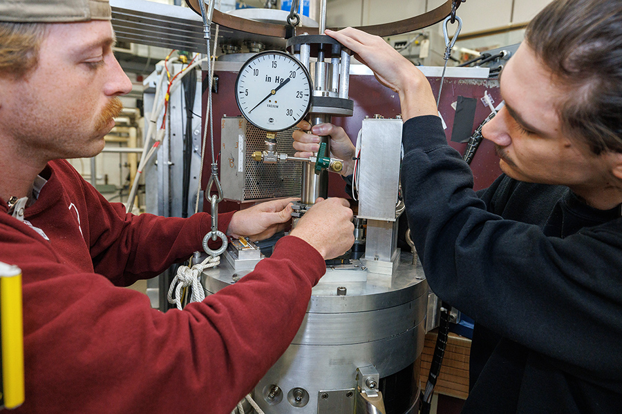 FSU graduate students Bryan Kelly and Ian Hay mounting a target for an experiment at the Split-Pole Spectrograph. (Bill Lax/FSU Photography Services)