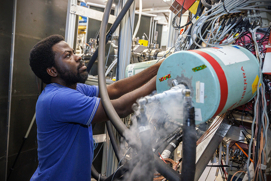 Graduate student Samuel Ajayi making sure that the high-resolution gamma-ray detectors of CLARION2 work correctly. (Bill Lax/FSU Photography Services)