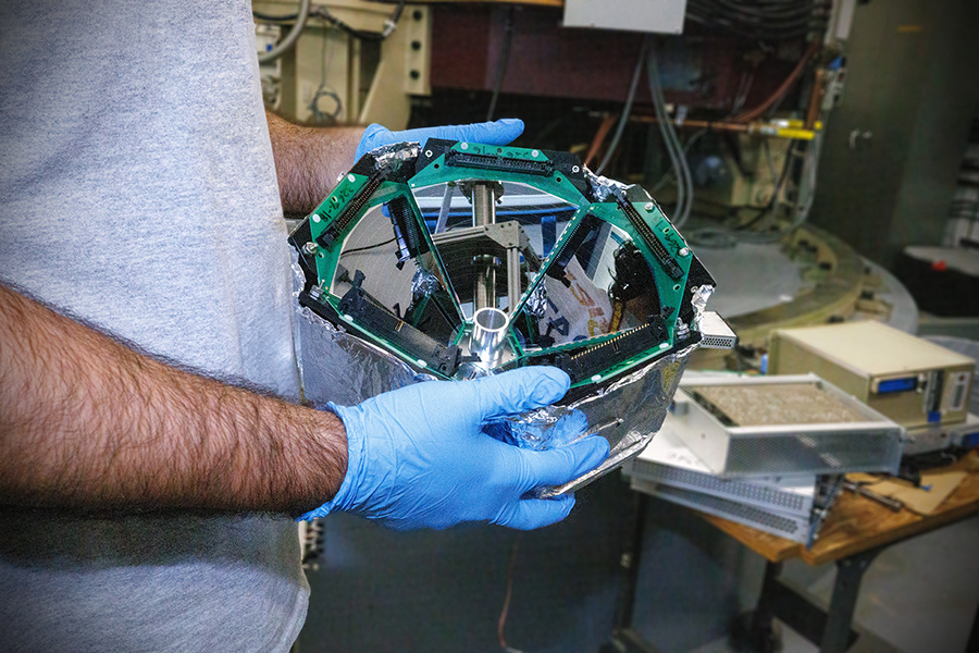 Lampshade silicon detectors of the Silicon Array for Branching Ratio Experiments, or SABRE, which is used to study the decay of unbound particle resonances relevant for nuclear astrophysics. SABRE was built in collaboration with scientists at Louisiana State University. (Bill Lax/FSU Photography Services)