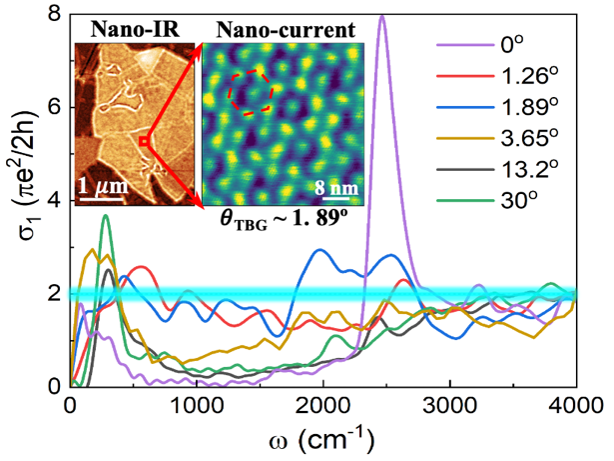 The team found that the optical conductivity of twisted bilayer graphene with boron nitride does not vary much with twist angle for angles of less than two degrees, even when the graphene is electrically doped and exposed to changing frequencies of infrared light.
